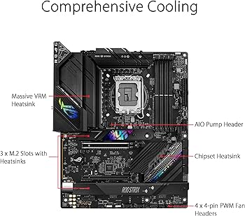 ROG’s premium power solution features robust VRM heatsinks and ProCool power connectors, ensuring stable power delivery to your CPU even during demanding workloads. This translates to better overclocking potential and long-term reliability for your high-performance build.