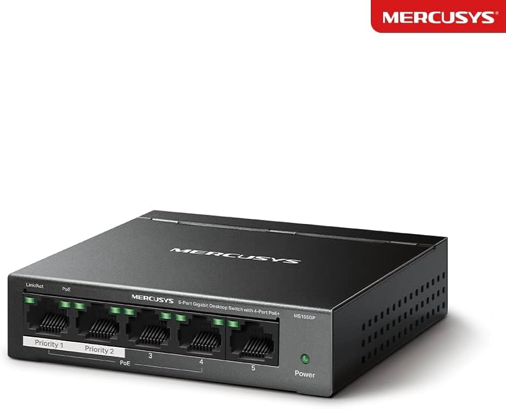The Mercusys MS105GP is a compact 5-port Gigabit desktop switch designed to expand your home or small office network with ease. Featuring 4 Power over Ethernet Plus (PoE+) ports, this versatile switch can power compatible devices like IP cameras, wireless access points, and VoIP phones directly through the Ethernet cable, eliminating the need for separate power adapters. With plug-and-play functionality and a durable metal housing, it’s the perfect solution for users looking to build a reliable, clutter-free network infrastructure.